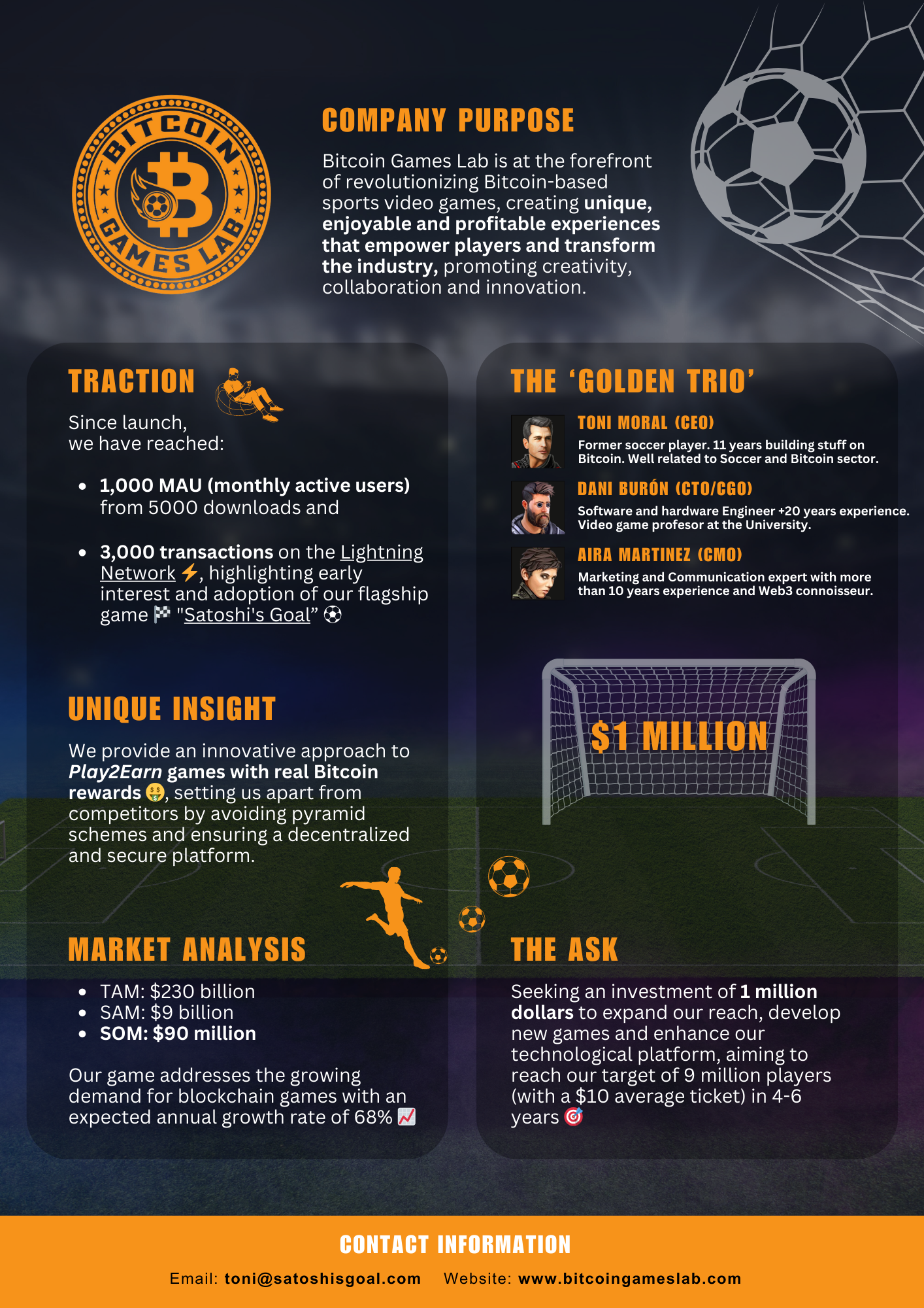 * **Innovative Gaming Ecosystem:** We are pioneering the integration of Bitcoin with popular gaming genres, starting with our flagship project, *Satoshi’s Goal*. This approach opens up new revenue streams and creates a sustainable, player-driven economy.
